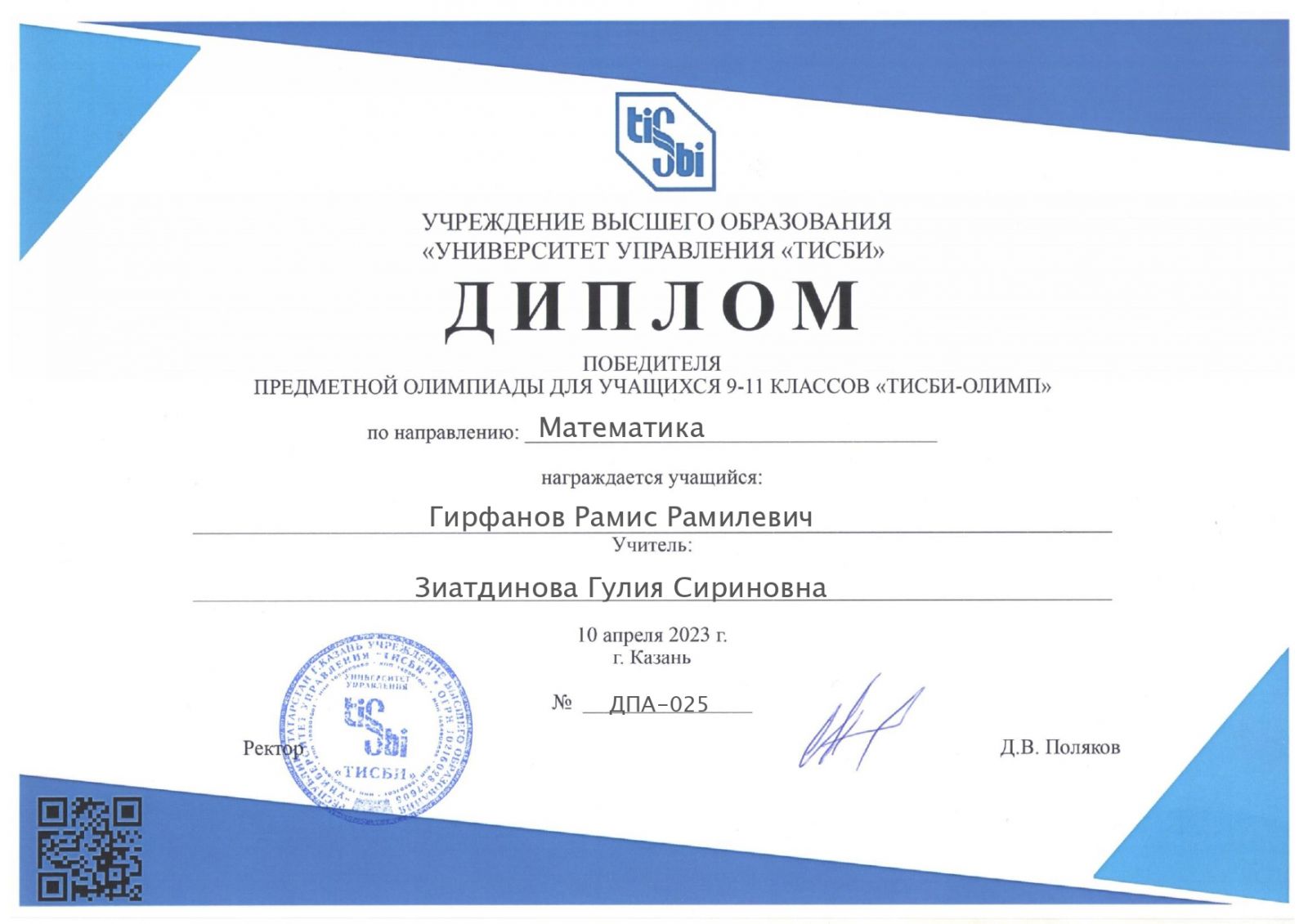 Подведены итоги предметных олимпиад. Ученик 9 «В» класса Гирфанов Рамис стал победителем олимпиады по математике. Учитель Зиатдинова Г.С. Поздравляем!!!