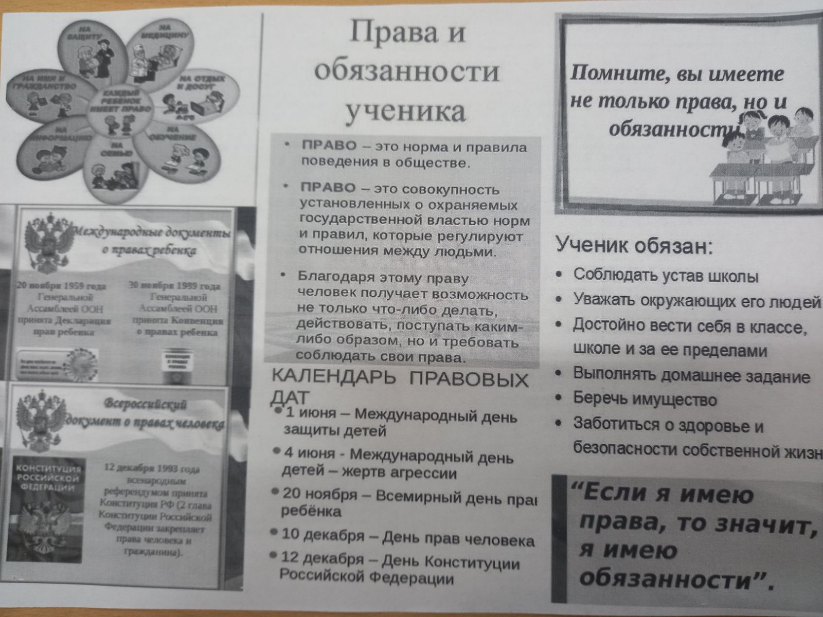 В рамках декады правовых знаний в 6б классе была проведена беседа учителем истории Гиматдиновой Р.Ф. о правах и обязанностях учеников. Учащиеся систематизировали знания и своих правах и обязанностях, приводили примеры, решали правовые задачки. Потом были распечатаны буклеты для родителей.