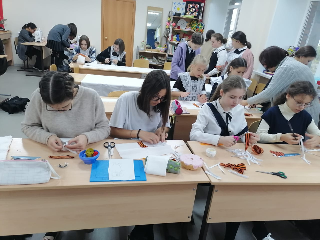 В рамках сетевого взаимодействия кружков “Проектирование в социальной среде” и “Технология и дизайн” учащиеся шьют белые повязки солдатам российской армии.