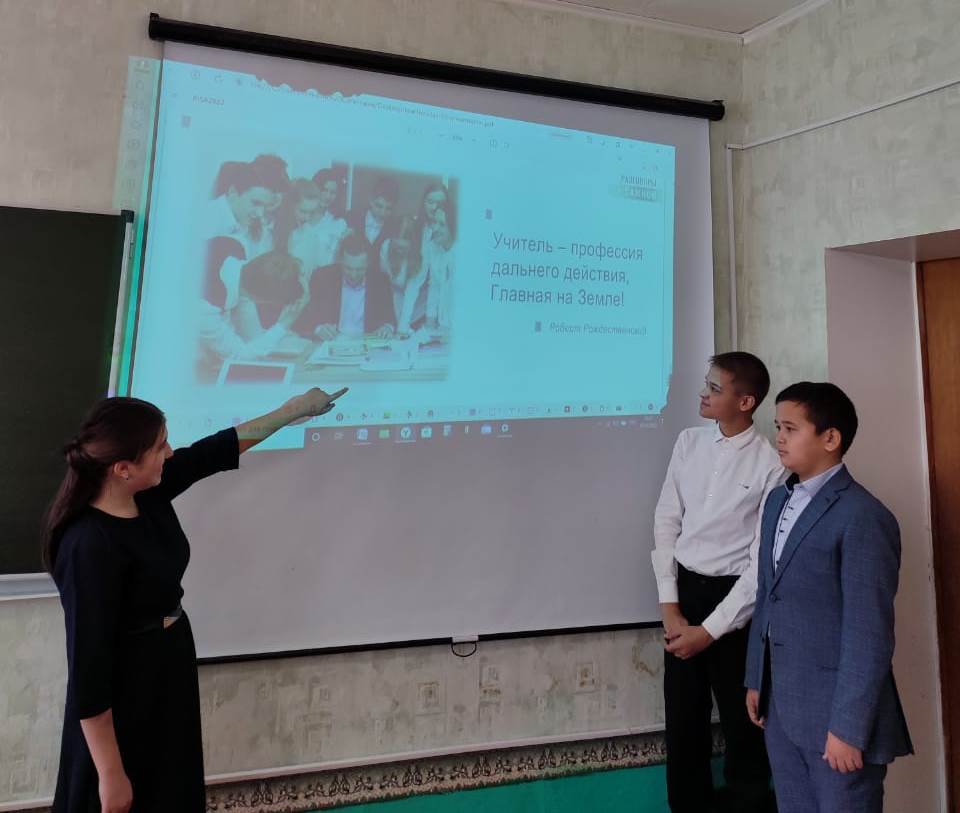Занятие началось с анализа стихотворения поэта Р.Рождественского о том, что учитель – это главная профессия на Земле. Учащиеся высказали свои мнения, привели примеры из жизни о значении данной профессии. Затем классный руководитель Хасмухаметова А.С. рассказала об известных учителях Шугуровской школы, оставивших свой яркий след в истории, педагогах-ветеранах Великой Отечественной войны, предложила посетить школьный музей, узнать как можно больше информации об учителях-фронтовиках. Далее заранее подготовившиеся ученики рассказали о конкурсе «Учитель года», о приоритетах профессии, дали информацию об учебных заведениях, где можно получить специальность учителя.