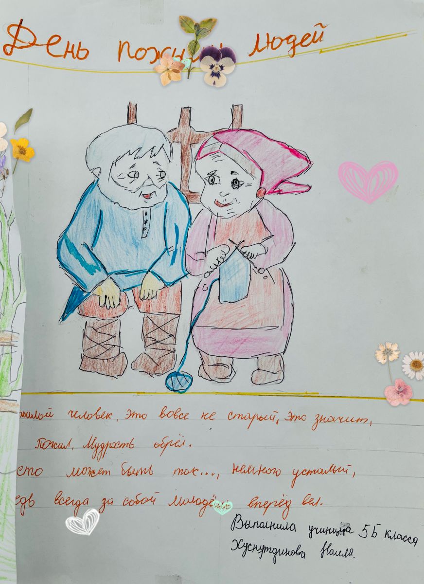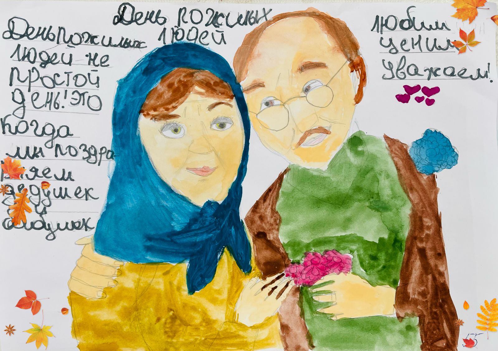 Учащиеся 5 «Б» класса, под руководством Хаматшиной А.М. , приняли участие в акции «Из детских рук – частичку теплоты». Акция социально значимая, потому что ее цель не только поздравить с праздником, но и привлечь внимание общества к проблемам людей пожилого возраста. Ко Дню пожилого человека ребята нарисовали красочные рисунки и посвятили их своим бабушкам и дедушкам.