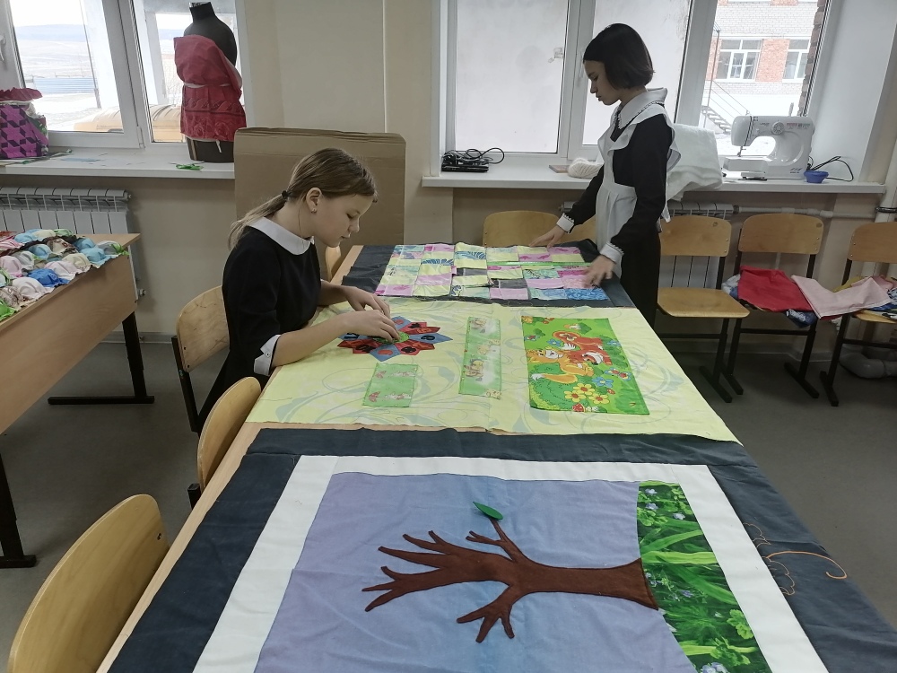 Продолжается совместная интегрированная работа в объединениях "Технология и дизайн" и "Проектирование в социальной среде" над бизибордом. Девочки работают в группах, создавая составные части - фрагментов проекта.