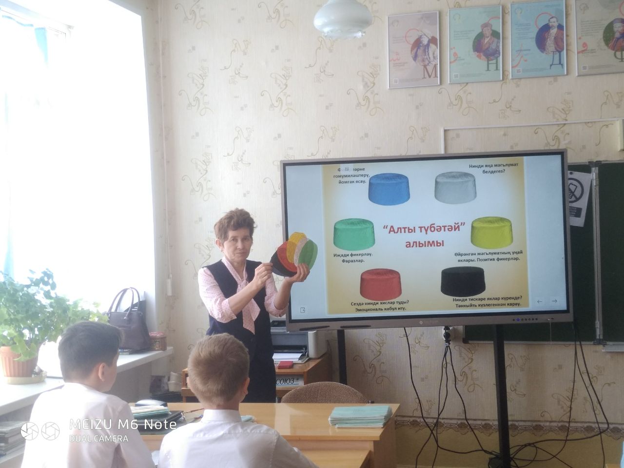Дәрестә критик фикерләү технологиясенең “Алты эшләпә” ысулын куллану отышлы булды. Әлеге ысул уку грамоталылыгын формалаштырырга ярдәм итә, укучыларны фикерләргә өйрәтә. “Алты эшләпә” ысулы ярдәмендә укучылар бирелгән текстны аңлап укырга, фикерләүнең алты ысулын күрсәттеләр. Нинди төстәге эшләпә алуга карап, укучылар укылган әсәр буенча геройларга карата үз фикерләрен белдерделәр, нәтиҗәләр чыгардылар.