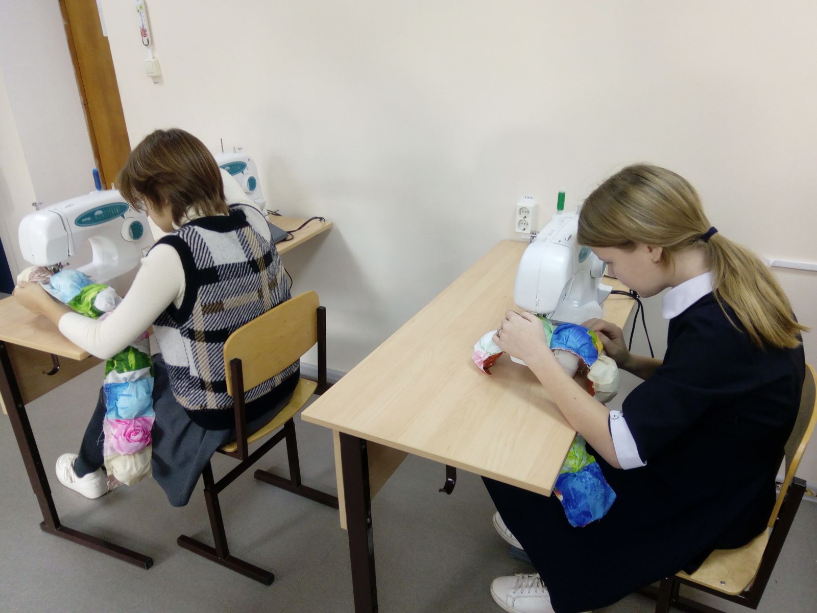 Продолжается совместная интегрированная работа в объединениях "Технология и дизайн" и "Проектирование в социальной среде" над бизибордом. Девочки работают в группах, создавая составные части - фрагментов проекта.