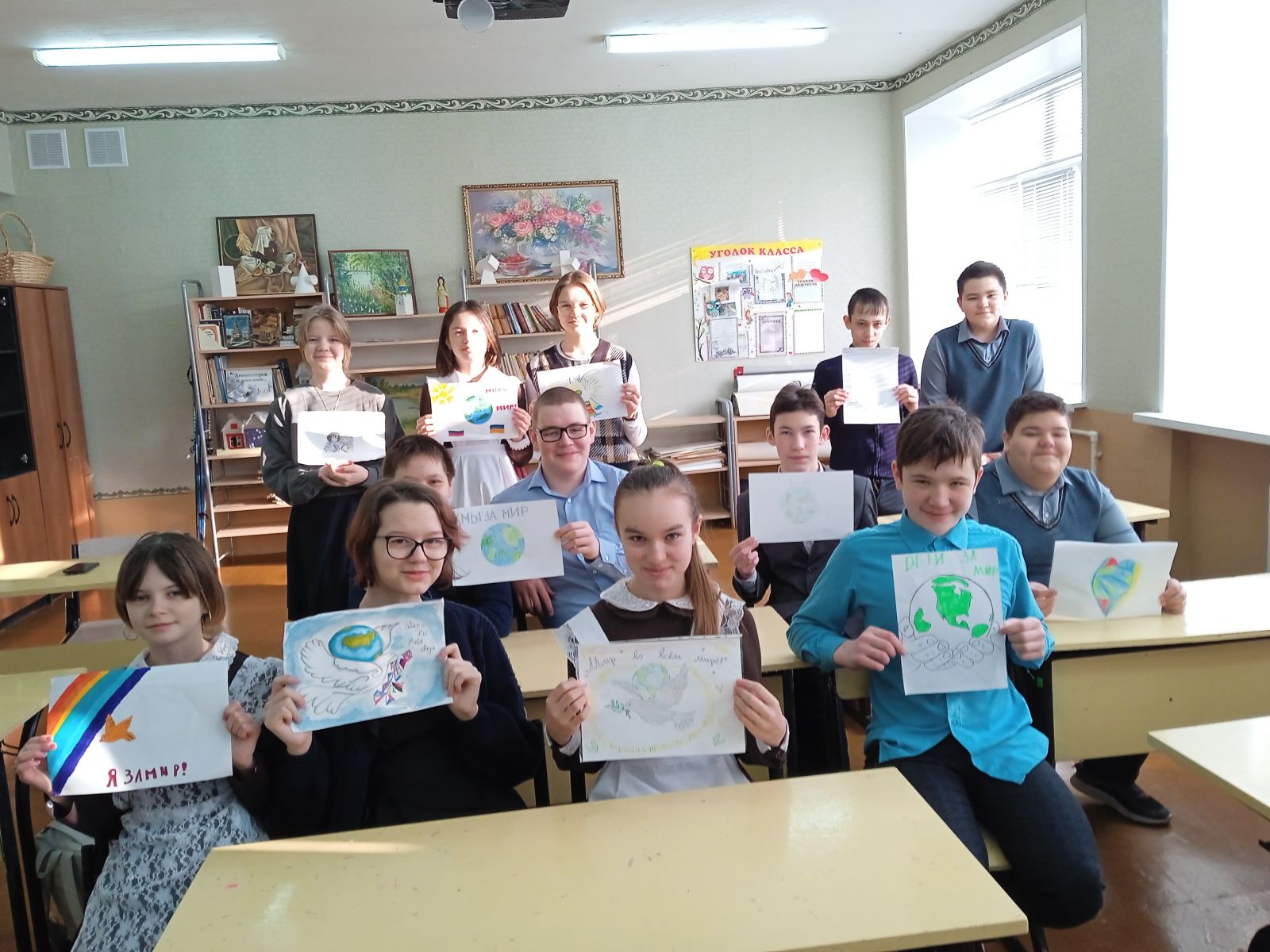 В Шугуровской школе имени В. П. Чкалова состоялась выставка рисунков "Наши дети рисуют мир". В работах учащихся отражается мечта о победе и мире на планете.
