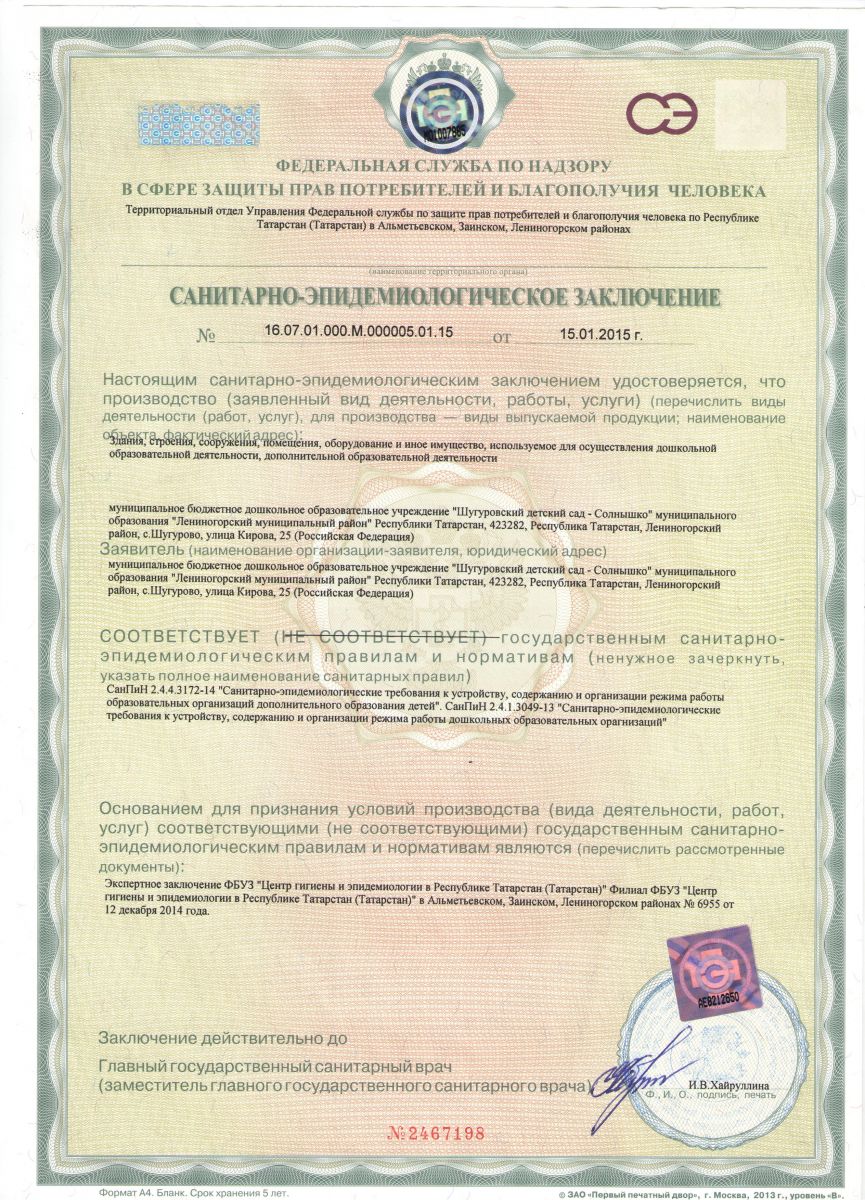 Санитарно-эпидемиологическое заключение от 15.01.2015 года
