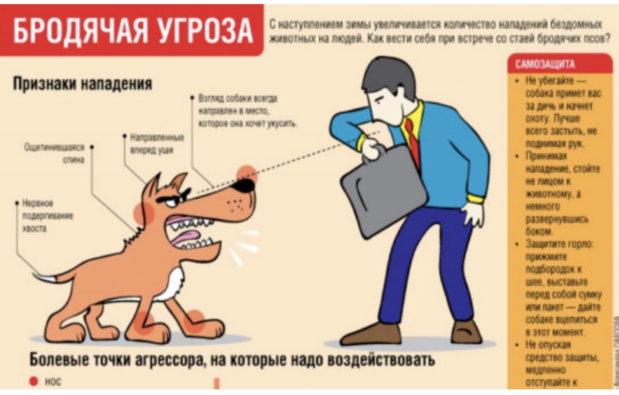 Если укус кажется неизбежным, используйте всё, что есть под рукой, чтобы защитить себя. Уязвимые места у собак — кончик носа, переносица, основание черепа, середина спины, живот.