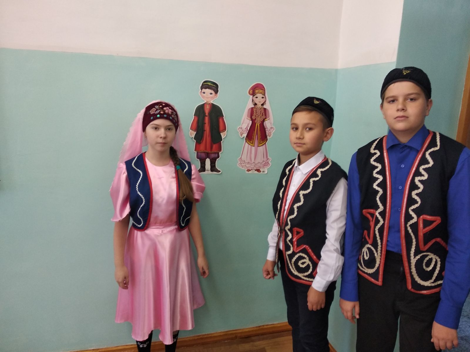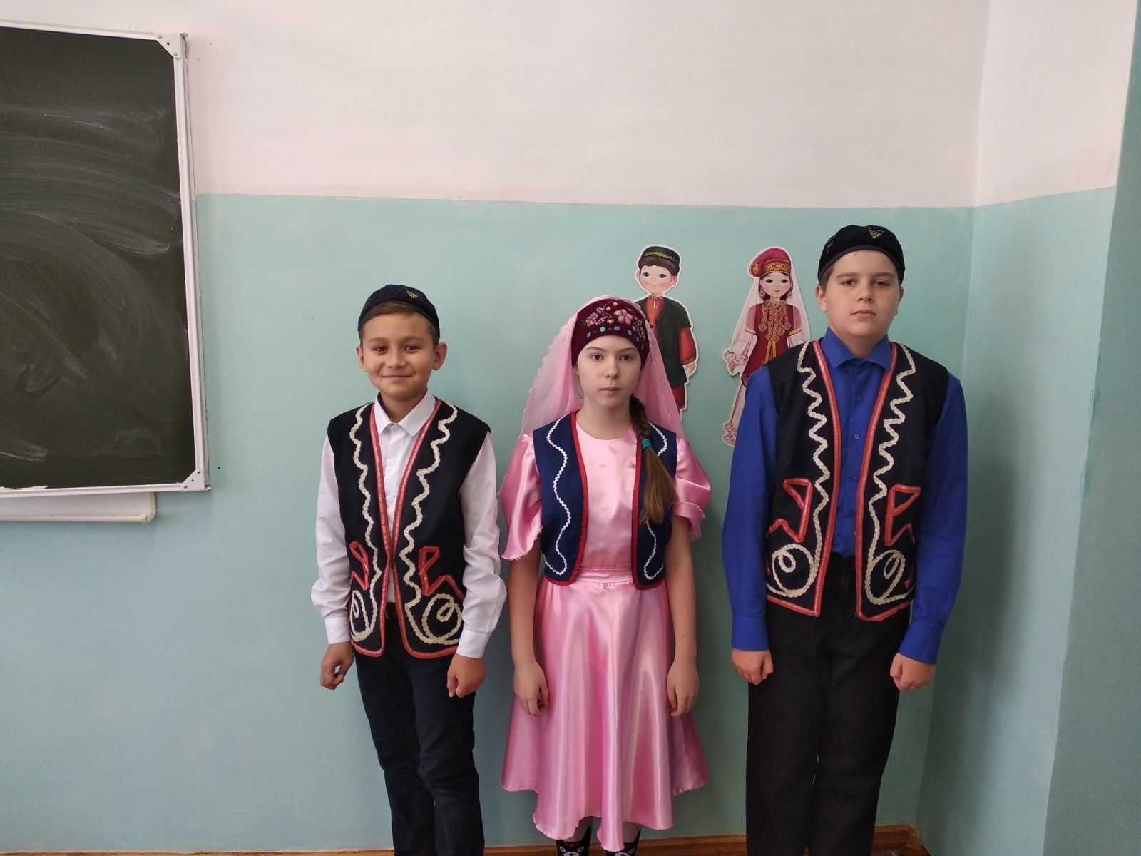 21 сентябрь - Халык костюмы көне. Бүген мәктәптә әлеге көнне билгеләп үттек. "Милли киемгә мәдхия" әдәби-музыкаль кичәсе узды. Кичәне оештыручылар: музыка укытучысы - Әхмәтова Ф.А., татар теле һәм әдәбияты укытучысы - Тахавова С.А. Татар теле укытучысы укучыларга милли татар киемнәре тарихын сөйләде. Укучылар милли киемнәргә киенеп карадылар, татар халык җырларын җырлап, татар биюен биеп күрсәттеләр.