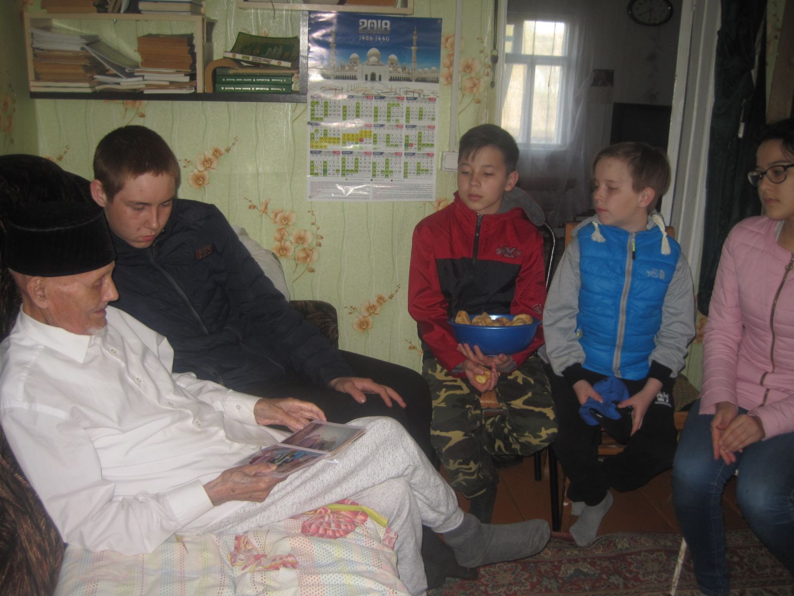 Сегодня волонтеры нашей школы посетили на дому ветерана ВОВ Мифтахова Мирзу Закиевича. Ребята поздравили Мирзу бабай с наступающим великим праздником День Победы. Ветеран вспомнил о тех трагических годах, как он еще совсем молодым, 18-летним парнем, ушел на фронт. Он служил в артиллерии. Учащиеся с интересом слушали его рассказ о том, как он привел в отряд живого фрица, "языка". Свои воспоминания он закончил словами: "Долг каждого достойного человека - защитить свою родную землю".