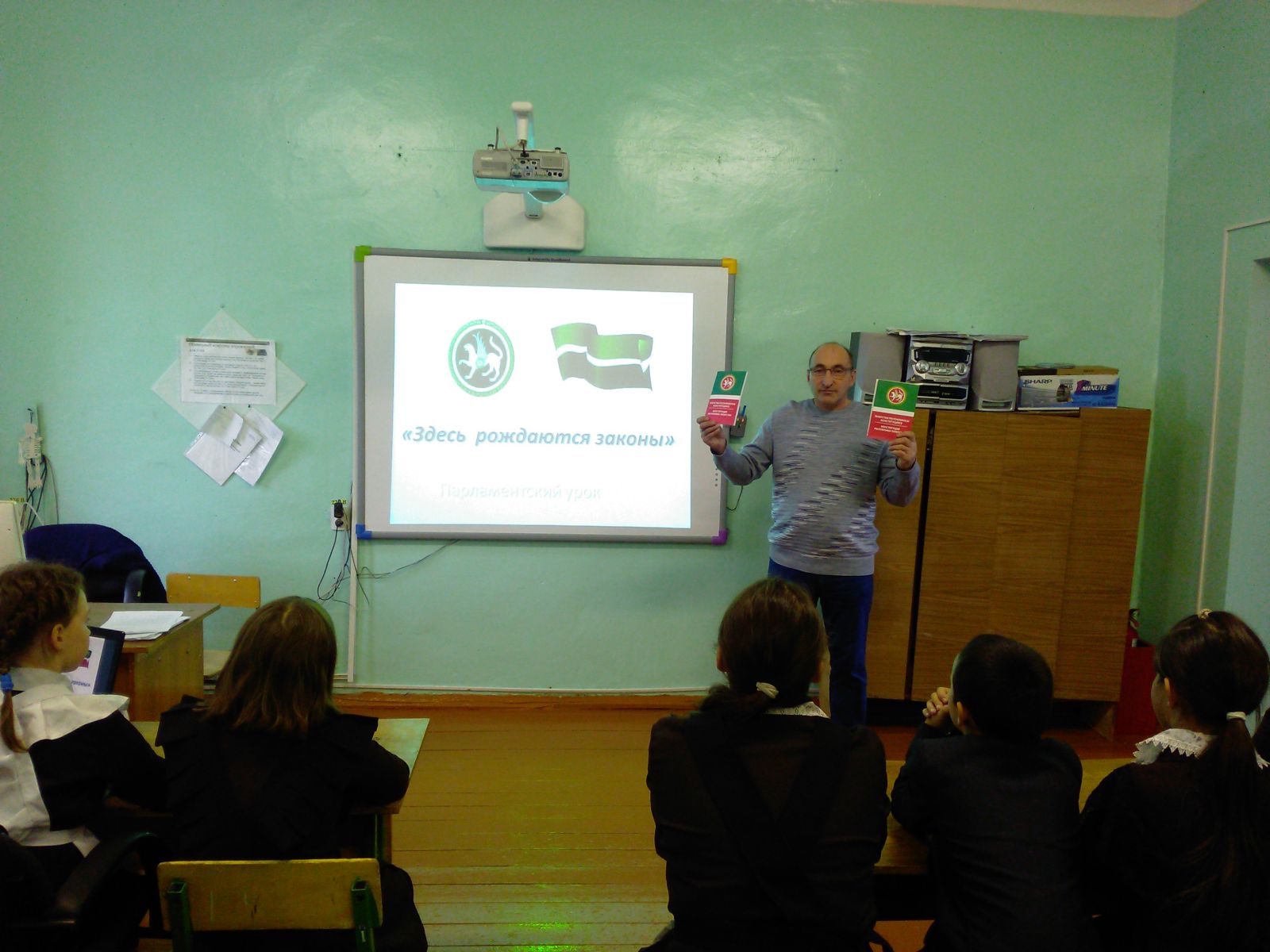 Сегодня в нашей школе прошел единый Парламентский урок. Данный урок был посвящен 25 летию принятия Конституции Республики Татарстан. Учитель обществознания Тахавов Р.М. рассазал учащимся об истории принятия Конституции РТ, о содержании данного документа и показал им презентацию.