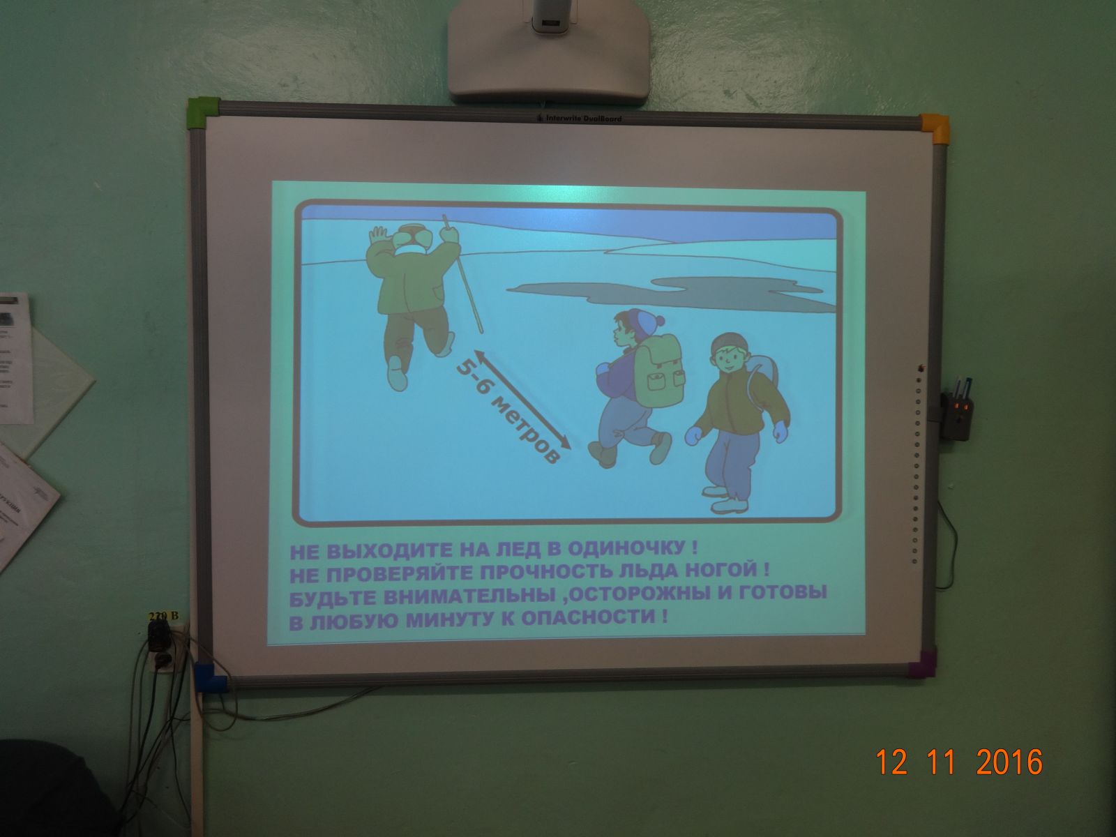В целях повышения безопасности детей в зимний период, предупреждения несчастных случаев с участием детей на водных объектах Республики Татарстан. В классах прошли классные часы на тему "Будь бдительным на льду". Классные руководители рассказали о правилах безопасного поведения вблизи водных объектов, о том как правильно действовать при спасении утопающих, провалившихся под лёд.