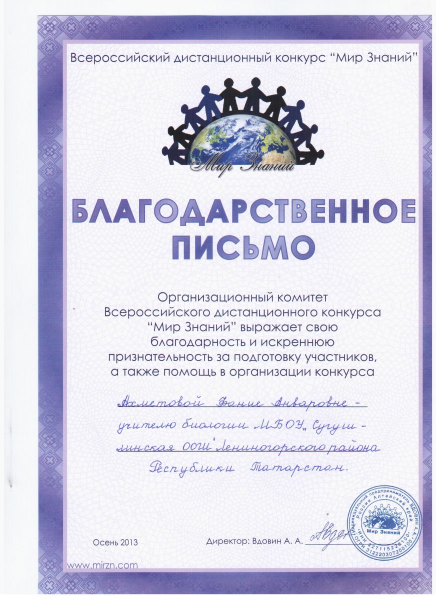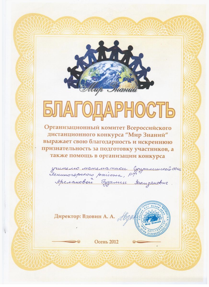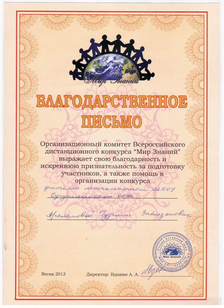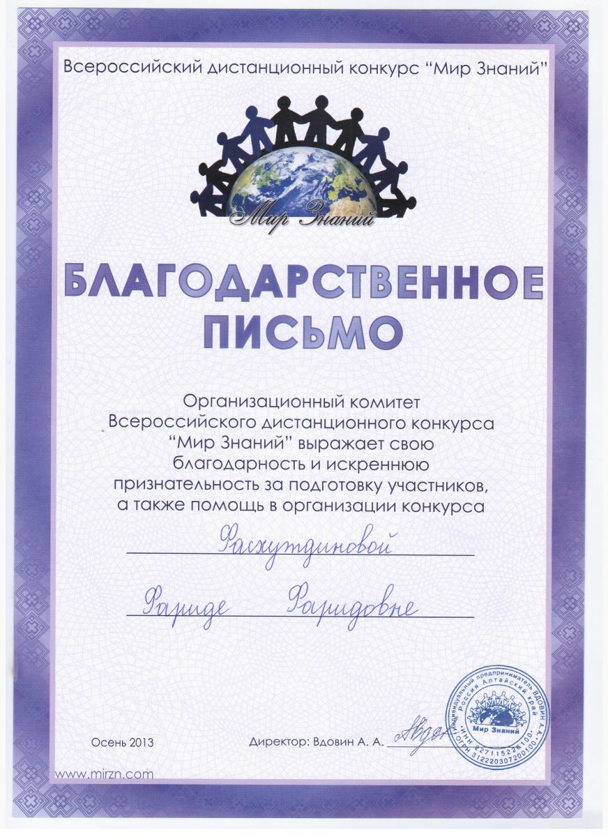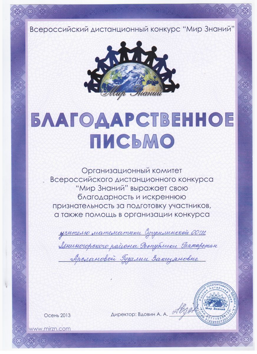 Благодарственное письмо " Мир знаний" Арсланова Г.З.