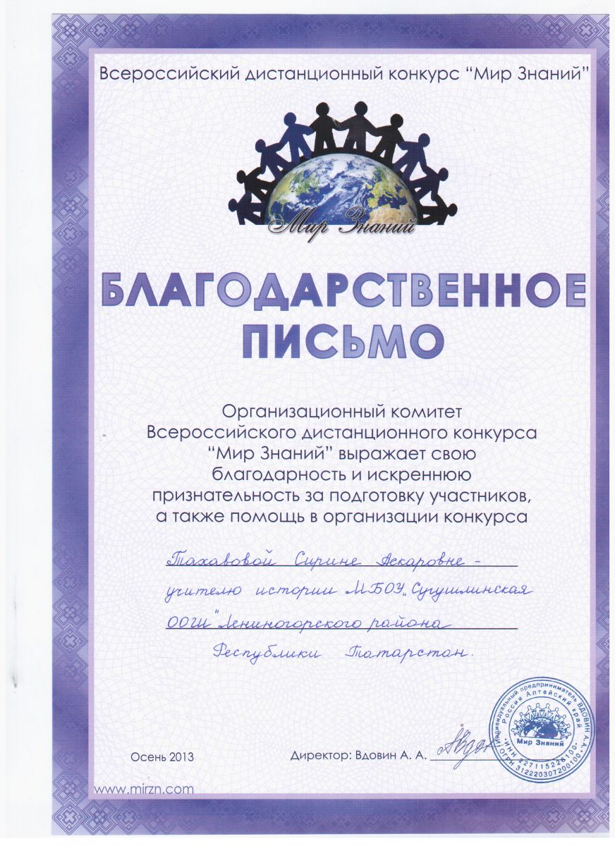 Благодарственное письмо "Мир знаний" Тахавов Р.М.
