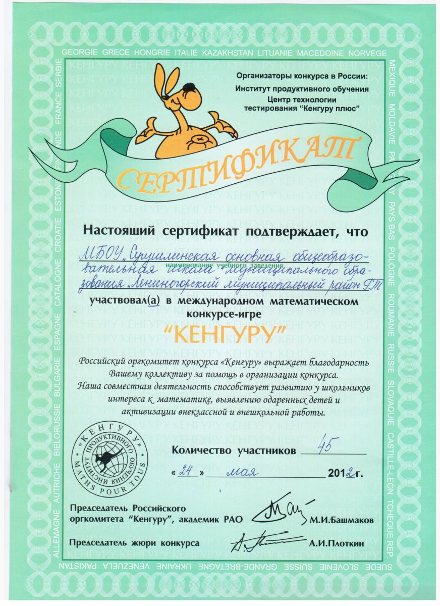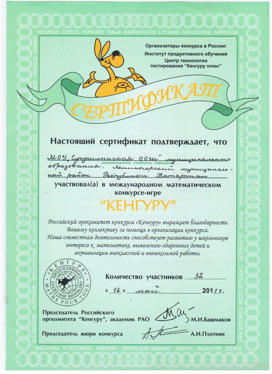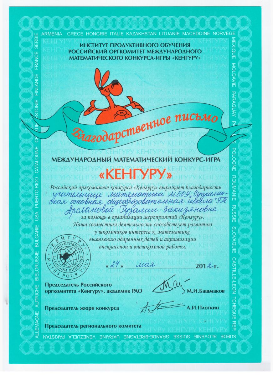 Благодарственное письмо "Кенгуру" Арсланова Г.З.
