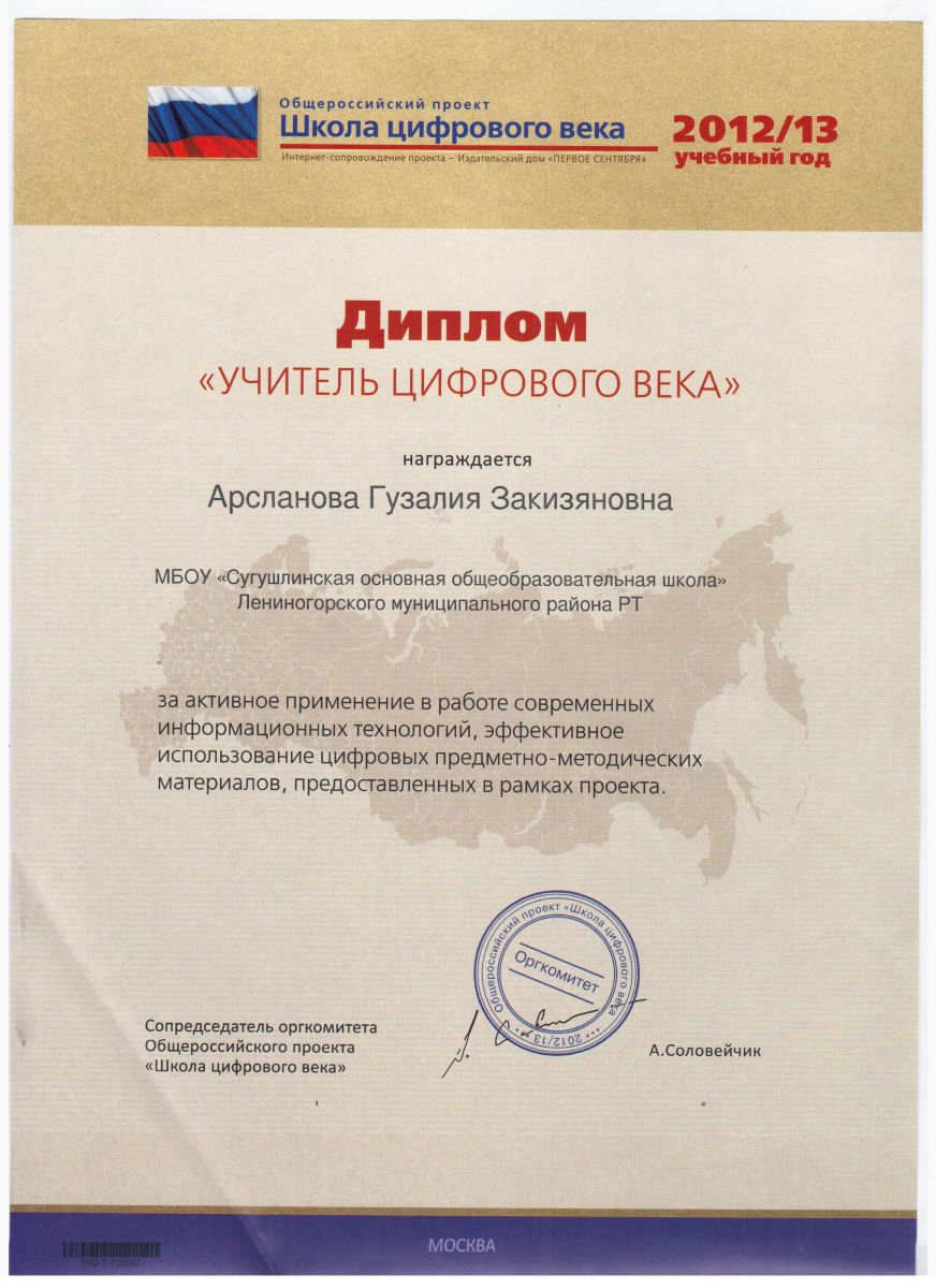 Диплом " Учитель цифрового века" Арсланова Г.З.