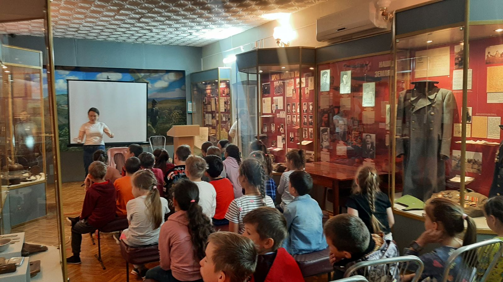 Для детей была проведена очень интересная и познавательная экскурсия по залу музея с разными экспозициями, которые помогали понять и увидеть быт наших предков. Особенно ребятам понравился зал «Памяти», посвященный Великой Отечественной войне. В этом зале были представлены фотопортреты ветеранов войны, списки награжденных орденами и медалями. В витринах- награды и наградные удостоверения, благодарственные письма, фронтовая переписка, личные вещи участников войны, макеты оружия. Учащиеся с удовольствием слушали, с любопытством рассматривали экспонаты.