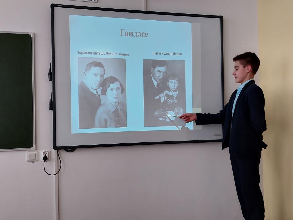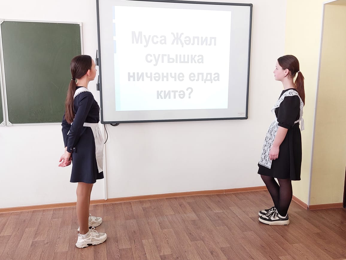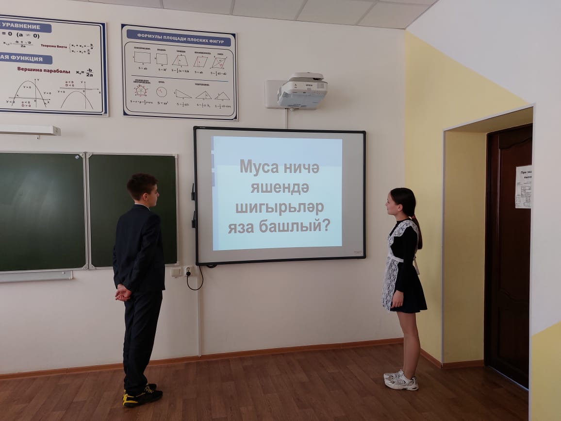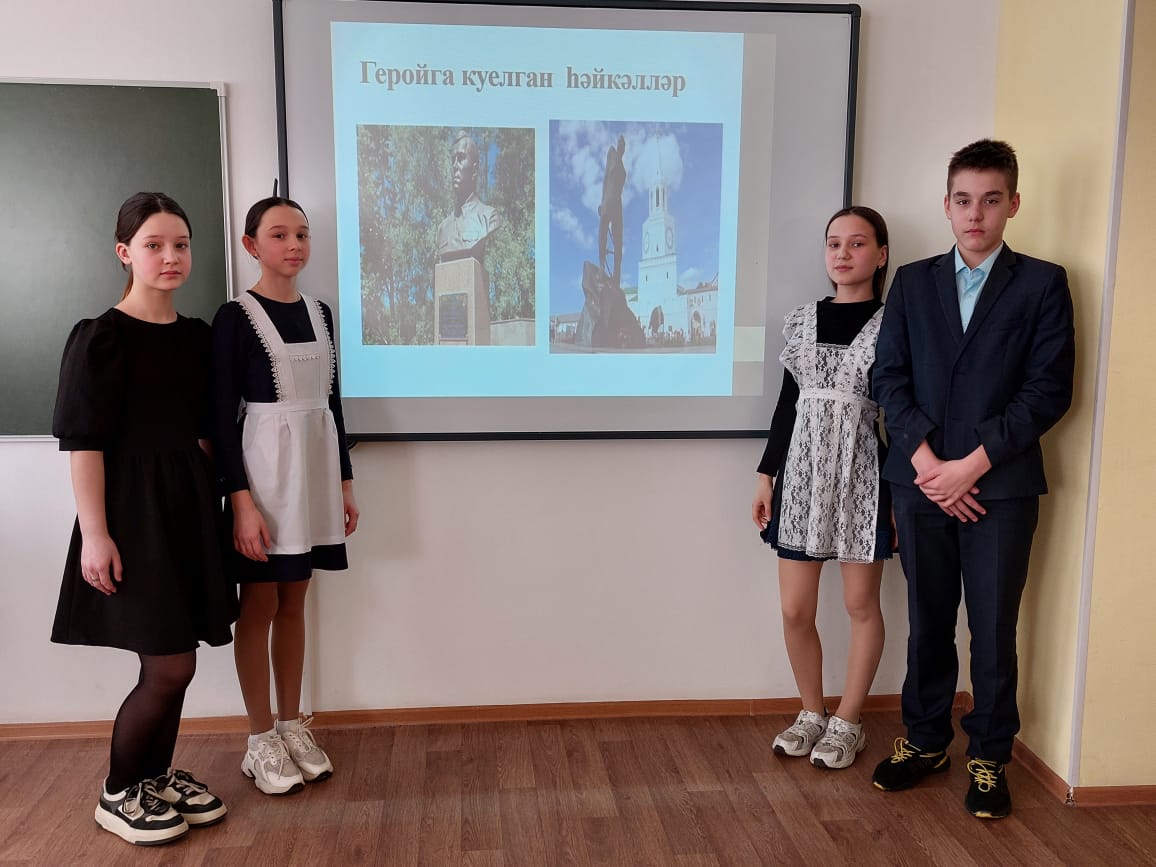 Опубликовано: 15.02.202415 нче февраль – герой шагыйребез Муса Җәлилнең тууына 118 ел була. Татар халкының бөек шагыйрен искә алу максатыннан 7а сыйныфында “Гомрем минем моңлы бер җыр иде...” дип аталган әдәби чара үткәрелде. Укучылар фашизмга каршы аяусыз көрәш алып барган Советлар Союзы Героеның каһарман юлы, әдәби иҗаты буенча викторина сорауларына җавап бирделәр, шигырьләрен яттан сөйләделәр.Әлеге искә алу чарасы һәр укучының күңелендә герой шагыйребезгә карата горурлану хисләре уятты.