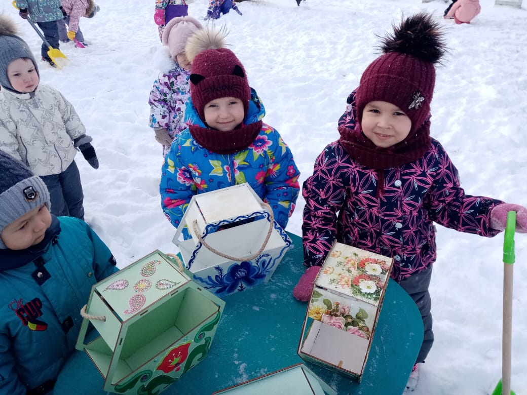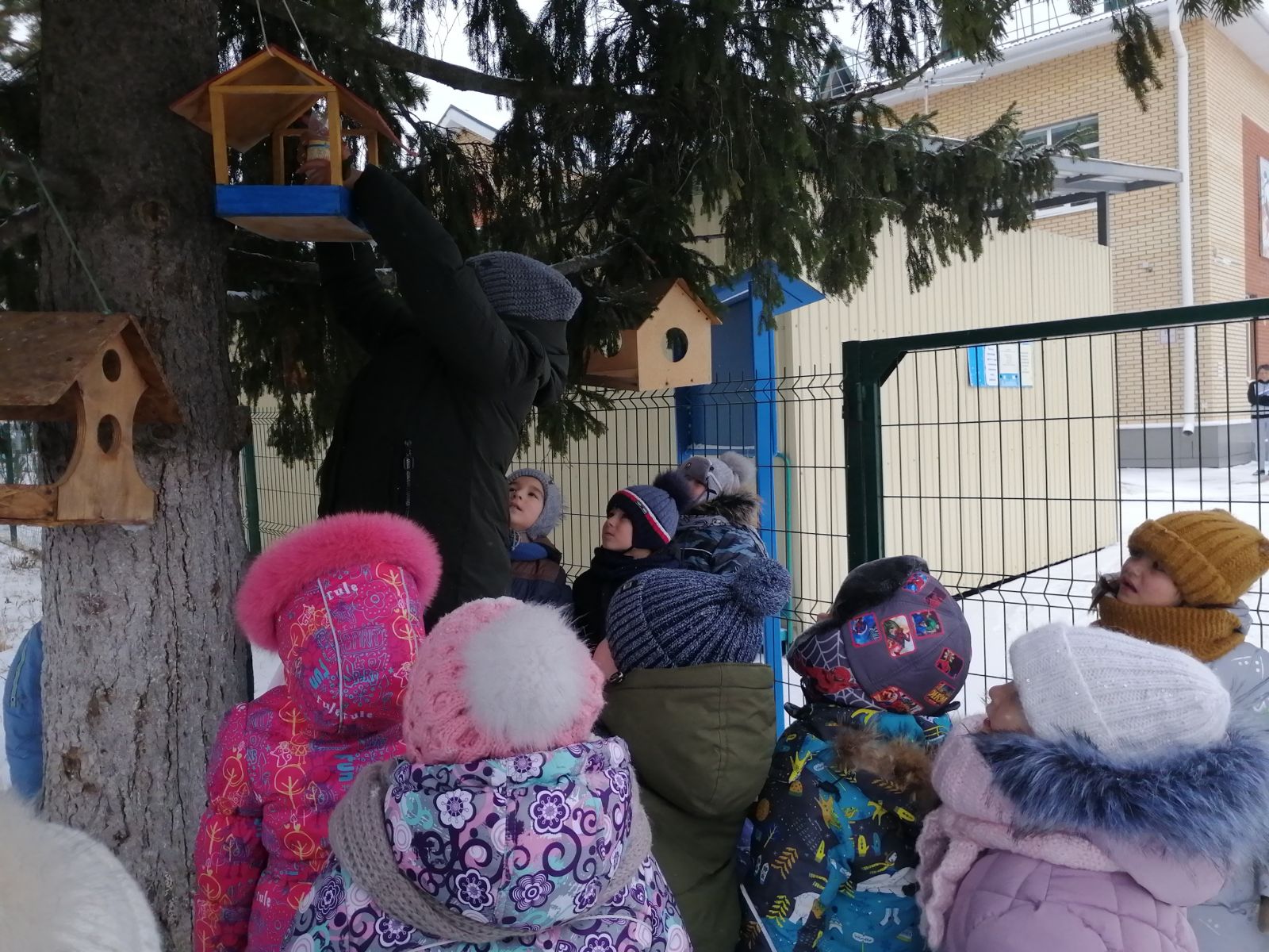 С приходом холодов коллектив детского сада проявляет заботу о пернатых друзьях, вывешивая кормушки и подсыпая с детьми ежедневно в них корм. Это очень радует детей ,помогает воспитывать в них доброту ко всему живому, сострадание и заботу. В этом году в рамках работы по проекту "Вклад в будущее" был установлен шест с крючками на прогулочных участках. В летнее время там висели кашпо с цветами, в зимнее время на нем вывесили кормушки для птиц. Кормушки выполнили в мотивах народного творчества(гжель,хохлома,городец)