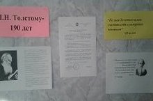 В школьной библиотеке школьным библиотекарем оформлен стенд, посвящённый Л.Н.Толстому, где учащиеся могут найти для себя много интересной иформации о великом русском писателе.