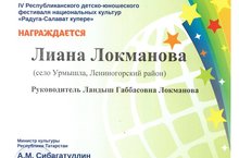 В рамках республиканской добровольческой акции "Весенняя неделя добра - эстафета добрых дел"ученица 9 класса нашей школы Лиана Локманова (руководитель - Локманова Л.Г.)участвовала на IV Республиканском детско-юношеском фестивале национальных культур "Радуга - Салават күпере" и стала лауреатом. Она награждена Дипломом Министра культуры РТ А.М.Сибагатуллина. Поздравляем!!! Новых творческих успехов тебе, Лиана!
