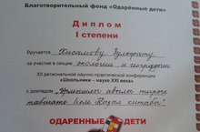 Ученик нашей школы Хисамов Зульфат (8кл) участвовав в XII региональной научно-патриотической конференции "Школьники-науке XII века (секция экологии и географии) выступив с темой "Урмышлы авылы тирәсе табигате һәм Кызыл китабы" (руководитель Газизова Р.М.) занял I место и был награжден ценным подарком.Поздравляем!!!!