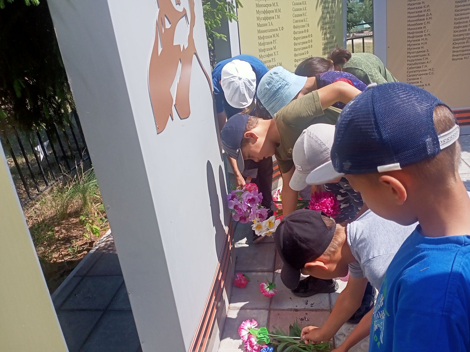 22 июня 2021 года в День памяти и скорби. В этот день ребята вспомнили основные события той страшной войны. Педагоги и воспитанники лагеря почтили минутой молчания память воинов-защитников, павших за Родину на полях сражений. Ребята вспоминали своих близких: дедов, прадедов, прапрадедов всех, кто отдал свой долг на благо нашей Родины.Возложили цветы у мемориала, установленного в честь воинов, ушедших на фронт и погибших в боях за Родину. Просмотрели фильмы о Великой Отечественной Войне,воспитанники посетили выставку в сельской библиотеке «День памяти и скорби».