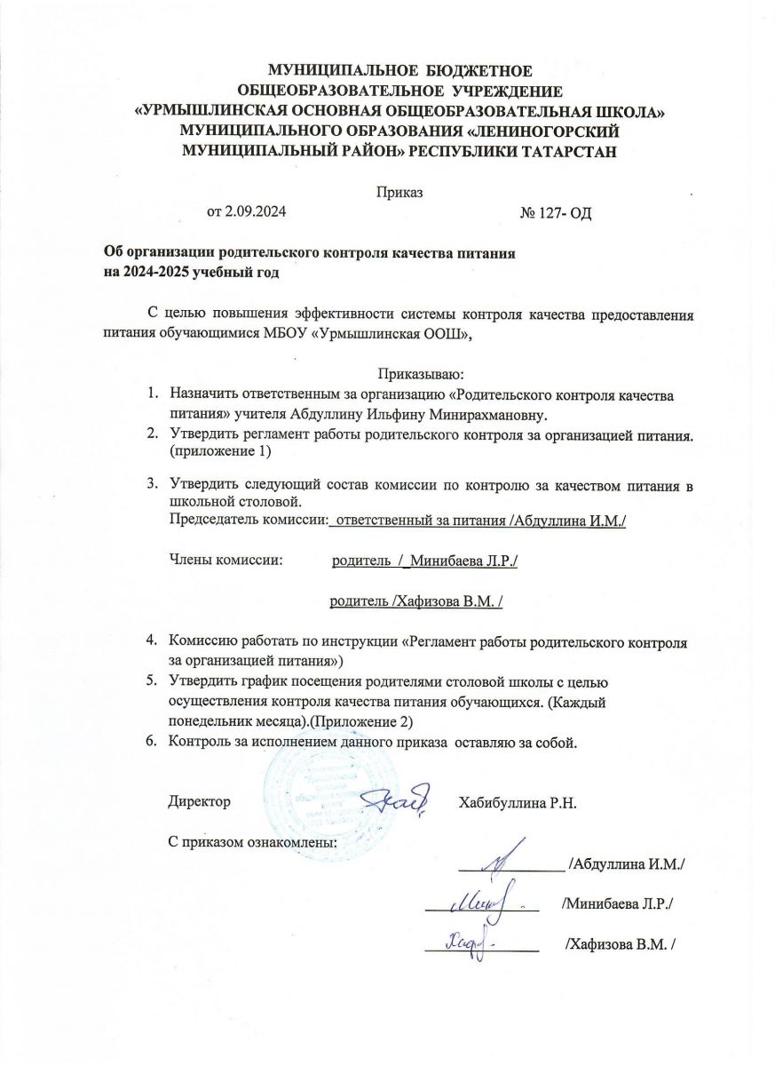 Приказ об организации родительского контроля качества питания на 2024-2025 уч.год