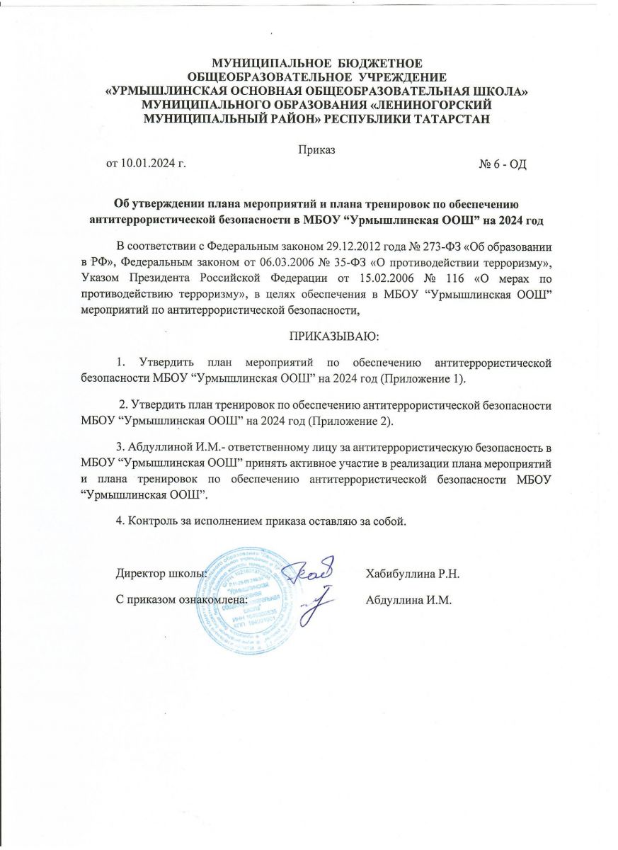 Приказ об утвеждении плана мероприятий и плана тренировок по обеспечению антитеррористической безопасности