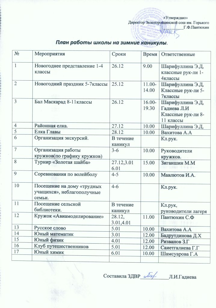 План работы школы на зимние каникулы.