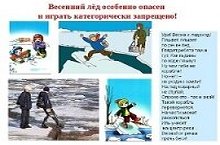 Весной ледяной покров под воздействием солнца и талой воды становится пористым и очень слабым, хотя и сохраняет еще достаточную толщину. На водоемах, в местах соприкосновения льда с берегом начинают появляться проталины, а на ледяном покрове рек - промоины и полыньи. Все должны знать, что по весеннему льду ходить нельзя (опасно!), даже если на первый взгляд он достаточно прочный.