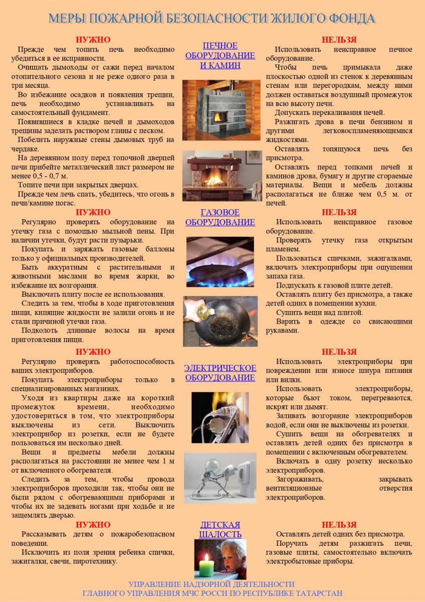 Перед началом отопительного сезона печи, котельные, другие отопительные приборы и системы должны быть проверены и отремонтированы. Неисправные печи и другие отопительные приборы к эксплуатации не допускаются.