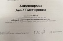 Поздравляем учителя начальных классов Анисахарову Анну Викторовну с 1 местом в конкурсе педагогического мастерства "Лучший урок по финансовой грамотности" в 1-4 классах.