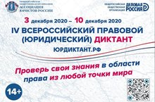 С 3 по 10 декабря 2020 года, в целях оценки уровня правовой грамотности населения, общероссийская общественная организация «Ассоциация юристов России» проведит Четвертый Всероссийский правовой (юридический) диктант. Информация ЗДЕСЬ