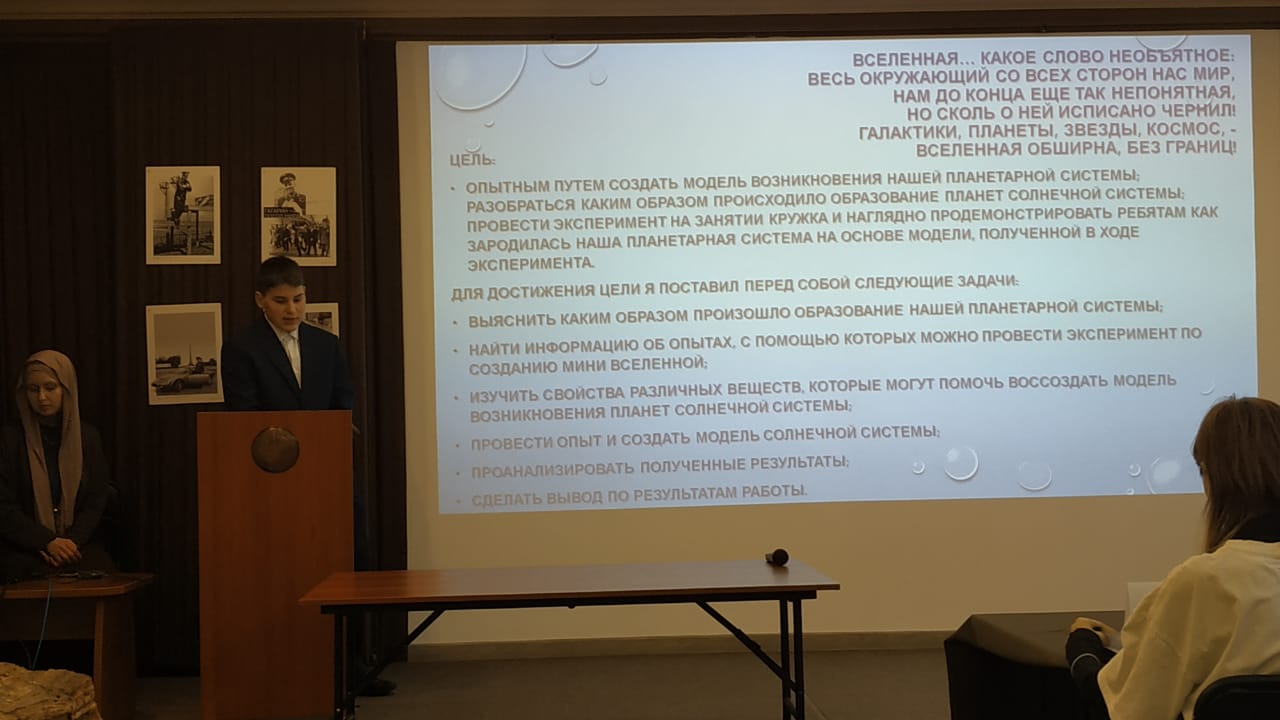 Среди немногочисленных финалистов был наш ученик 7 класса – Лукманов Аскар, который достойно выступил и защитил свою проектно-исследовательскую работу «Вселенная: тайна зарождения», с чем мы его все поздравляем. Так держать!