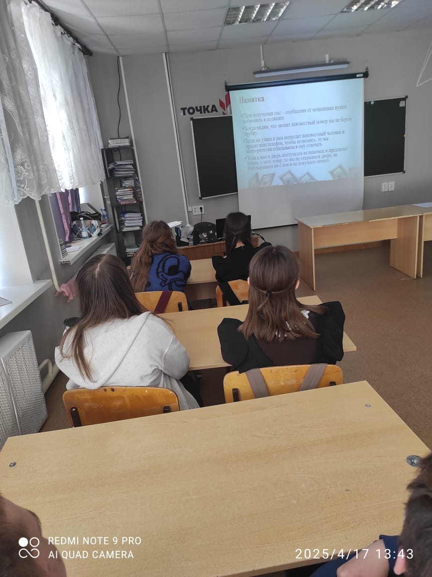 17 апреля 2025г прошли тематические классные часы: «Помоги себе сам»( 1 кл), «Опасность мошенничества и правила безопасности»( 2,4 кл), «Мошенничество в интернете»( 5 кл), «Осторожно мошенники» ( 6 кл), « Как не стать жертвой мошенников» (7 кл), « Осторожно, мошенники!» ( 8 кл), « Как не стать жертвой мошенников»( 9 кл), «Виды мошенничества и способы обезопасить себя» ( 10-11 кл).