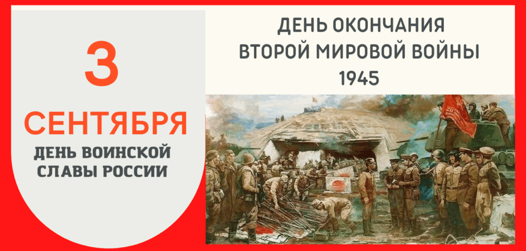 Опубликовано: 03.09.2025День воинской славы России – 3 сентября 1945 года – День Победы над милитаристской Японией и окончания Второй мировой войны (1945 год). В этот день был подписан акт о безусловной капитуляции Японии, что положило конец Второй мировой войне. 3 сентября 1945 года советская пресса опубликовала обращение Сталина И.В. к народу. Там говорилось об окончании войны с Японией.