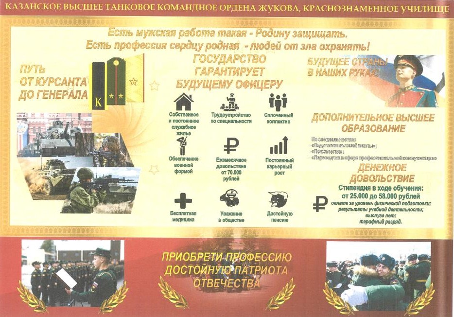 Опубликовано: 22.11.2025В целях ознакомления и оказания профориентационной поддержки в области выбора военных специальностей 11 декабря 2025 года состоится выездная экскурсия для учащихся 9-11 классов в Казанское высшее танковое командное Краснознамённое училище (далее – КВТККУ) согласно графику МО и Н РТ