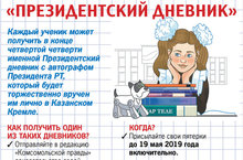 В целях формирования привлекательного образа современного педагога и повышения мотивации к получению знаний среди школьников Республики Татарстан Министерством образования и науки Республики Татарстан совместно с представительством газеты «Комсомольская правда» в Республике Татарстан объявлен проект «Президентский дневник» (далее – Проект).Проект представляет собой масштабный республиканский конкурс на самую высокую успеваемость за право получить лично из рук Президента именной «Президентский дневник» с автографом для школьника и диплом от министра образования и науки Республики Татарстан для классного руководителя.Чтобы принять участие в конкурсе на «Президентский дневник» школьник должен получать отметки «5» (отлично) в течение IV четверти текущего учебногогода, самостоятельно или совместно с родителями отправлять в редакцию газеты «Комсомольская правда» на электронный адрес kpkzn @ yandex . ru или в WhatsApp+79061118800 (необходимо указать полное Ф.И.О. ученика, район (или город), школу, класс и контактный телефон совершеннолетнего представителя)доказательства своей успеваемости (скриншоты электронных дневников или фотографии страниц бумажных дневников) до 19 мая 2019 года включительно.По итогам конкурса победители, у которых больше всего оценок «5» (отлично), и их классные руководители приглашаются для встречи с Президентом РеспубликиТатарстан и вручения «Президентского дневника» с автографом Президента.