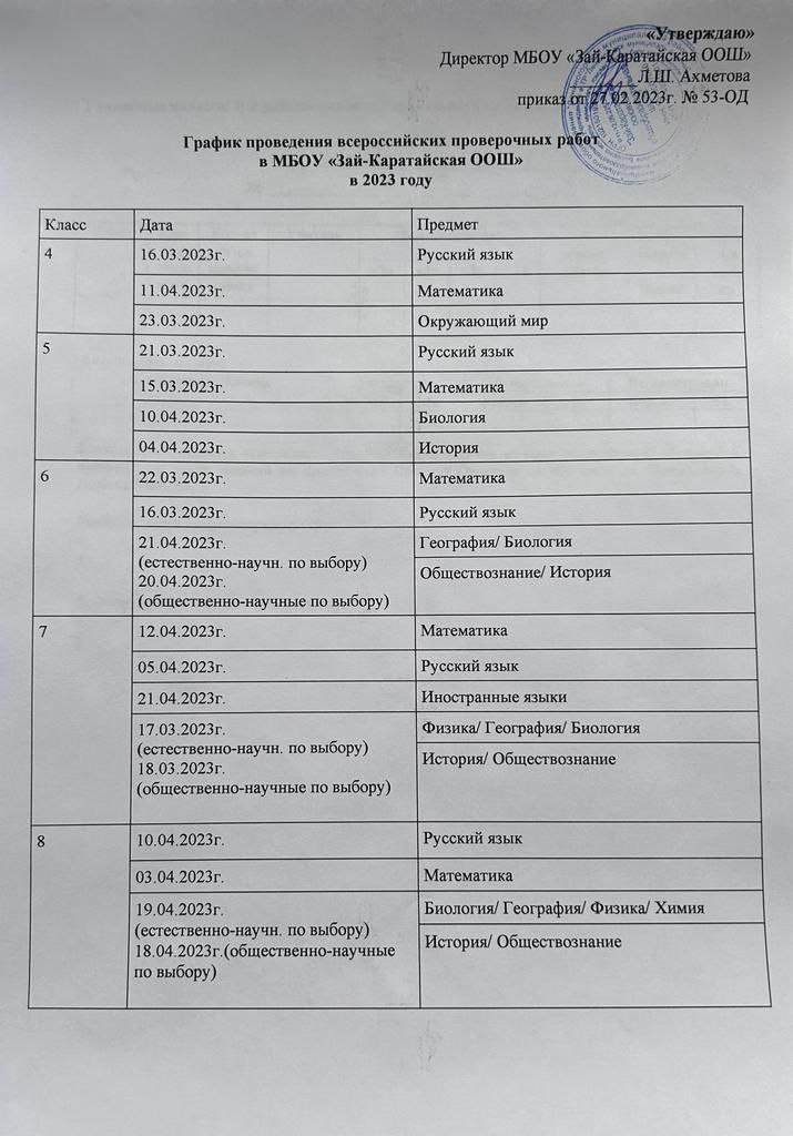 8.График проведения ВПР в МБОУ "Зай-Каратайская ООШ" в 2023 году