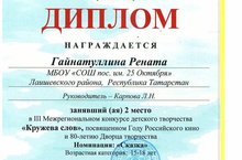 Ученица 9 класса Гайнатуллина Рената заняла 2 место в III Межрегиональном конкурсе детского творчества "Кружева слов", посвящённом Году Российского кино и 80-летию Дворца творчества с работой "Не теряйте веры в чудеса" . Номинация: "Сказка" в возрастной категории 15-18 лет. Учитель Карпова Л.Н.