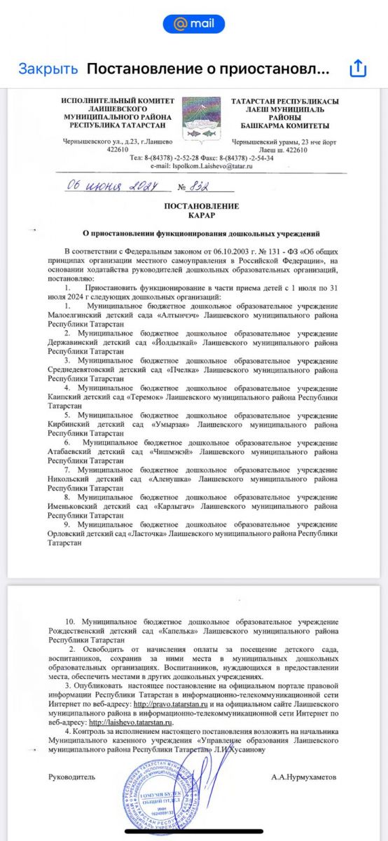 приказ "О приостановлении функционирования дошкольных учреждений" с 01.07.2024 г до 31.07.2024 г.