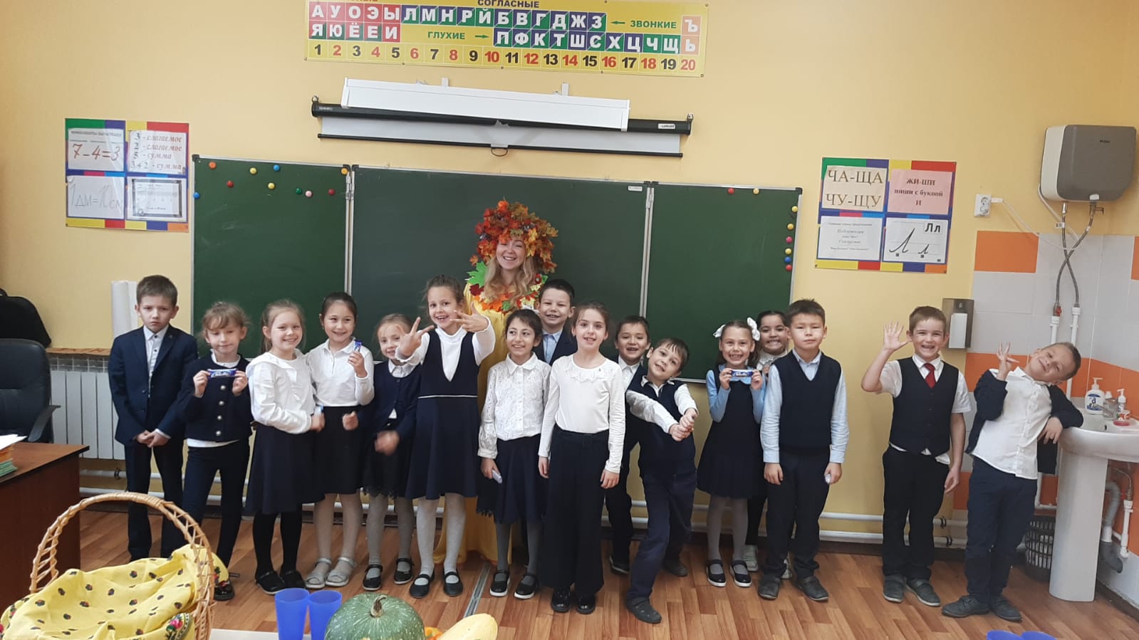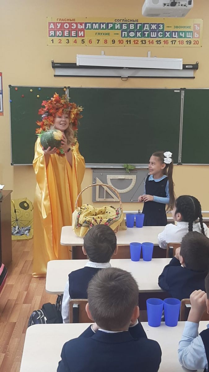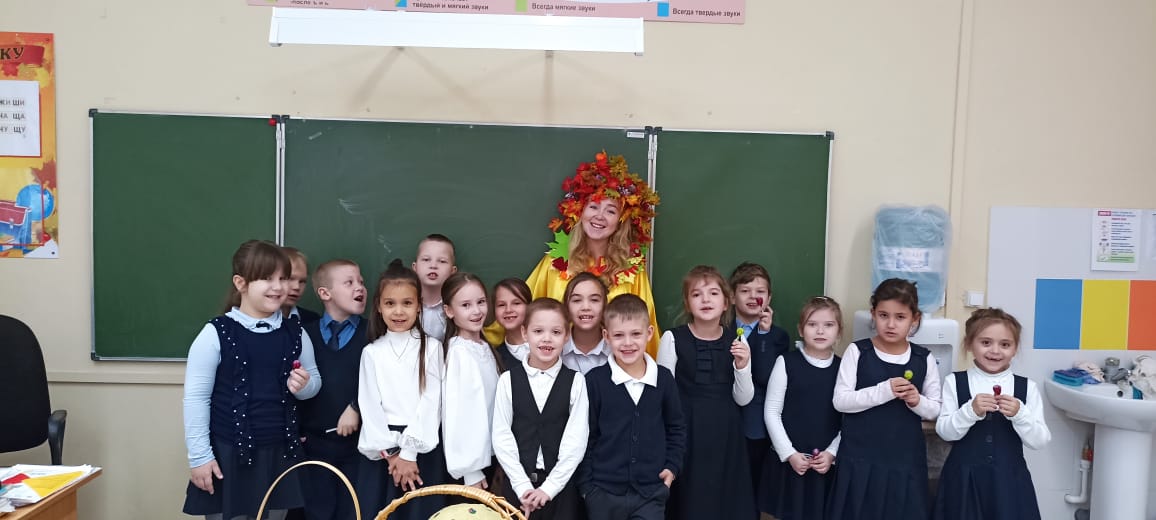 На улице пасмурно и холодно, не хватает солнечного света, а в наших первых классах царила теплая, доброжелательная атмосфера. В гости к ребятам пришла осень-красавица.