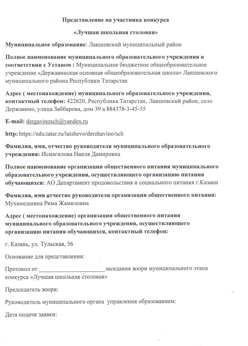 Представление на участника конкурса "Лучшая школьная столовая - 2024"