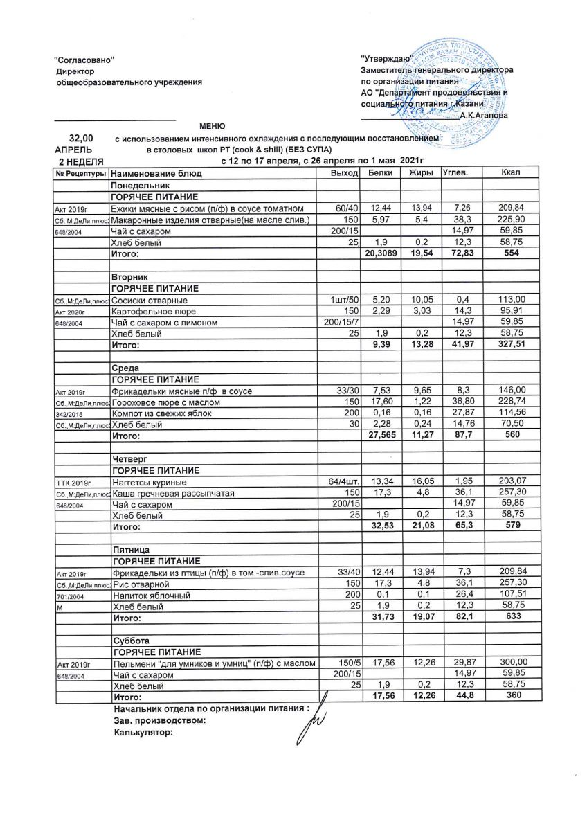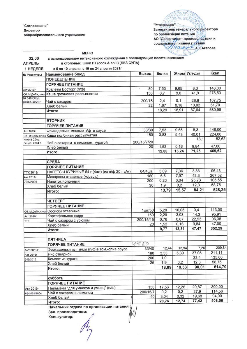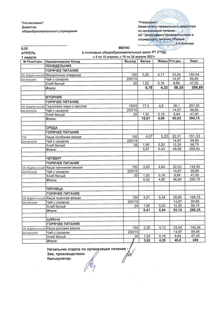 Меню на апрель. Нечетная неделя для 5-11 классов.