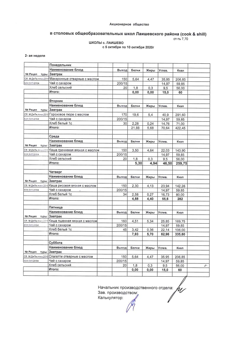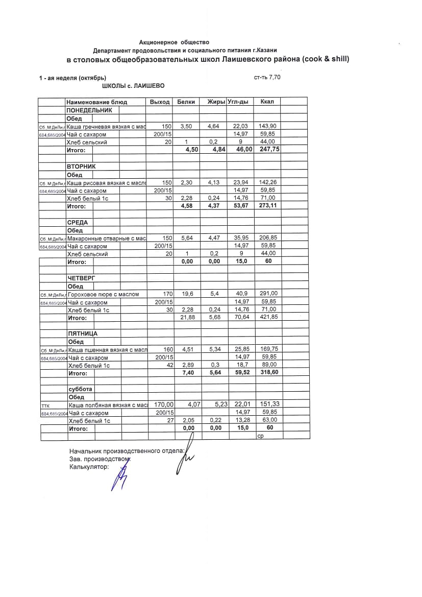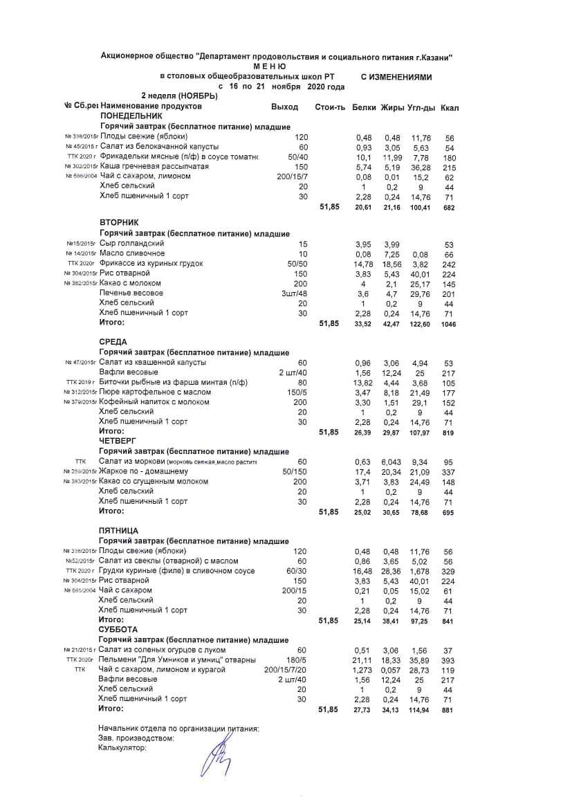 меню на октябрь. Четная неделя. Бесплатное питание для 5-11 классов.