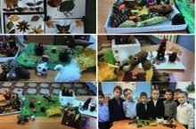 Ученики 1 класса сделали аппликации из листьев и поделки из шишек.