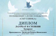 Хореографичческий коллектив "Экспромт" Детской школы искусств г. Лаишево (преподаватель Валиуллов Р.Ш.) стал Лауреатом II степени во Всероссийском конкурсе посвященный 75-летию Победы в ВОВ "Смуглянка".