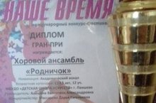 В г. Москва подведены итоги Международного конкурс-фестиваля "Наше время". Хоровой ансамбль "Родничок" "Детской школы искусств" г. Лаишево руководитель Алешина Валентина Александровна, концертмейстер Массарова Дарья Евгеньевна стал обладателем ДИПЛОМА ГРАН-ПРИ. Наши поздравления и успехов в творчестве.
