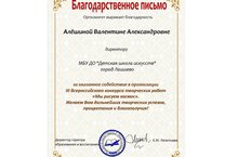 Центр образования и воспитания выражает благодарность Алешиной В.А. директору "ДШИ" г.Лаишево за оказанное содействие в организации