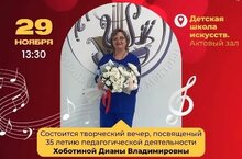 29 ноября 2025 года в 13.30 ч. в актовом зале школы искусств г.Лаишево пройдёт юбилейный творческий вечер Хоботиной Дианы Владимировны. 35 лет – целая симфония из уроков, гамм и блестящих побед учеников! Приглашаем отпраздновать этот творческий юбилей вместе с педагогом по фортепиано Дианой Владимировной. Это будет большой, душевный концерт, где встретятся несколько поколений учеников. Мы услышим, как музыка оживает в руках детей и взрослых, прозвучат стихи и танцы. В программе: выступления учеников разных лет, выступление именинницы Дианы Владимировны, музыкальные сюрпризы, поздравления, стихи, танцы, море хороших эмоций.